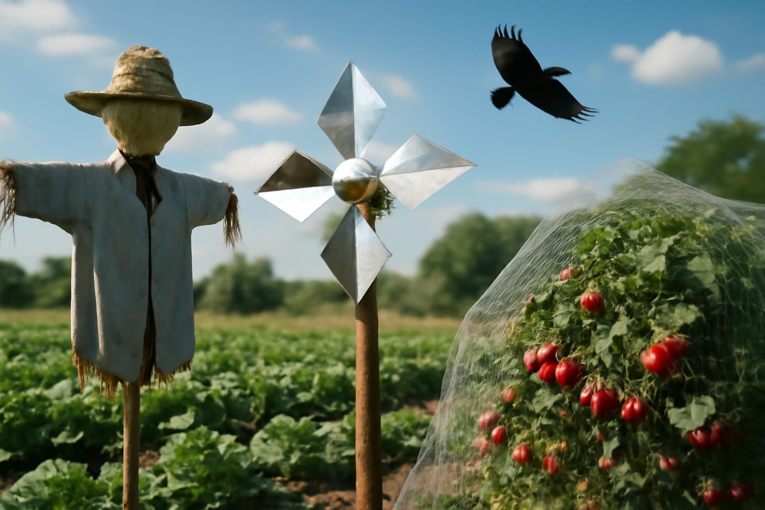 | Barrières physiques | Filets et pics empêchant les corbeaux de se poser. | Protection durable pour les cultures. |
